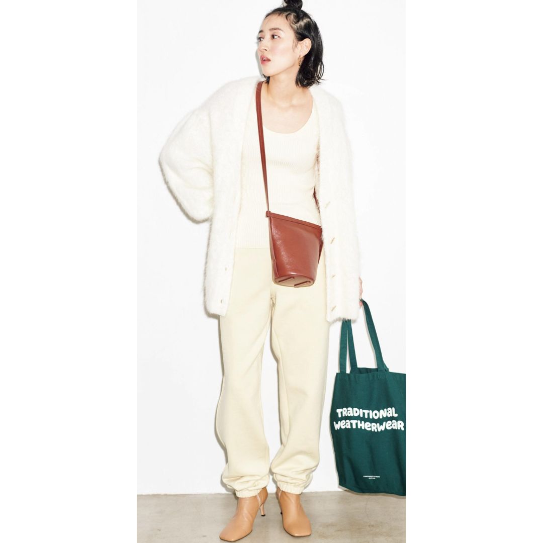 ニットカーディガン¥19,800(セルフォード/セルフォード ルミネ新宿1店)タンクトップ¥6,930(アルページュストーリー)スウェットパンツ¥31,900(オーラリー)イヤリング¥8,640(アビステ)ショルダーバッグ¥96,800(アットコレクティブ/オデット エ オディール 新宿店)トートバッグ¥4,400(トラディショナル ウェザーウェアー/トラディショナル ウェザーウェアー ルミネ有楽町店)ブーツ¥37,400 (2.718/ガリャルダガランテ 青山店)