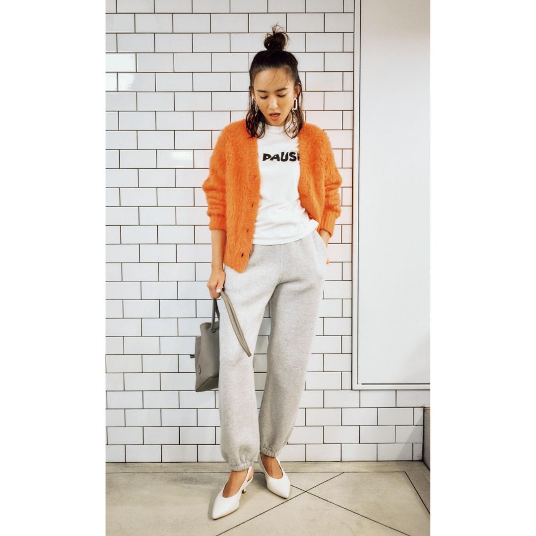オレンジカーディガン¥72,600(ブリル/エレメントルール カスタマーサービス)ロゴTシャツ¥7,150(ザ ポーズ/ウィム ガゼット ルミネ新宿店)スウェットパンツ¥18,480(ザ シンゾーン/シンゾーン ルミネ新宿店)ピアス¥22,000(ブランイリス/ブランイリス トーキョー)バッグ¥46,200(ヴァジック/ヴァジックジャパン)靴¥14,850(スローブ イエナ/スローブ イエナ 自由が丘店)