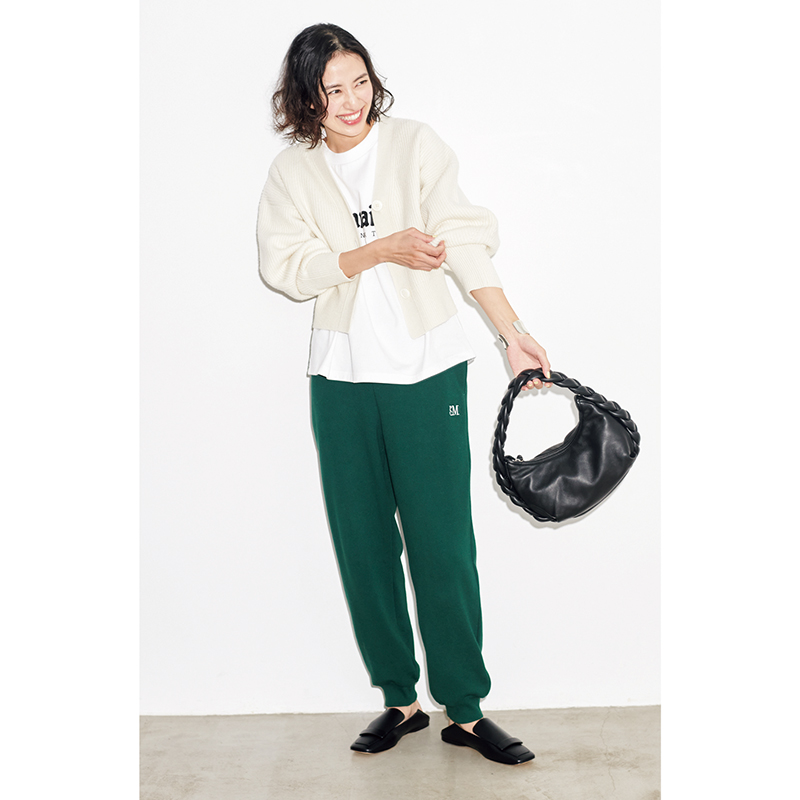 ショートカーディガン¥31,900(マルティニーク/マルティニーク ルミネ横浜)ロゴTシャツ¥12,100(ソルト/プルミエ アロンディスモン)スウェットパンツ¥18,480(PARROTT CANVAS/スローブ イエナ 自由が丘店)バングル¥94,380※参考上代(アフターシェイヴクラブ)バッグ¥71,500(ヘリュー/ショールーム セッション)ローファー¥128,700(セルジオ ロッシ/セルジオ ロッシ カスタマーサービス)