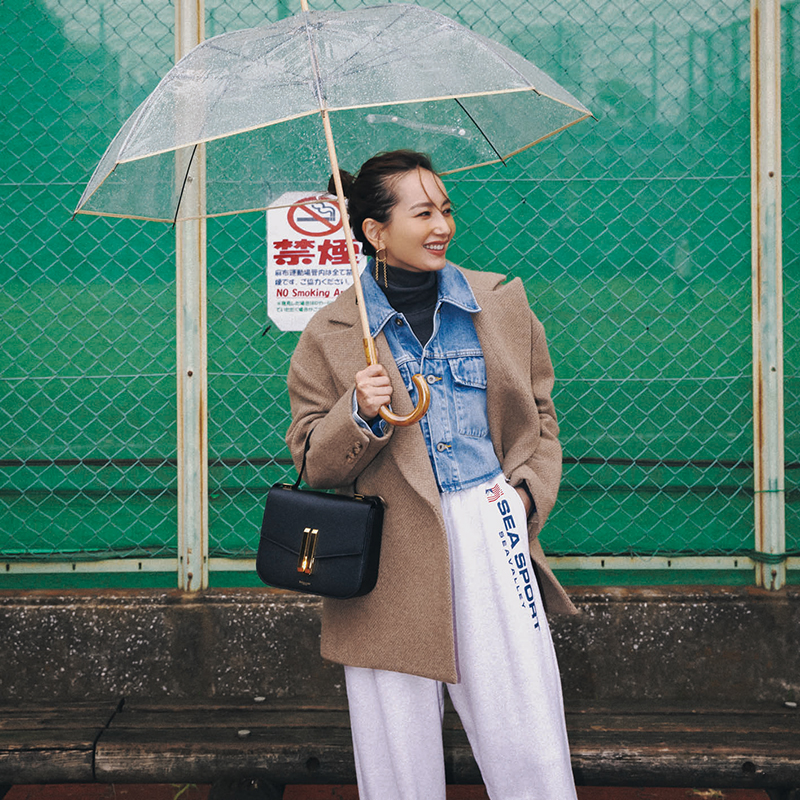 ジャケット¥47,300(エミ/エミ ニュウマン新宿店)デニムジャケット¥29,700(フレイ アイディー/フレイ アイディー ルミネ新宿2店)リブニット¥8,478(ミラ オーウェン/ミラ オーウェン ルミネ新宿2店)スウェットパンツ¥27,500(シー/エスストア)バッグ¥72,600(デメリエー/ルル・ウィルビー/アルアバイル)ピアス¥33,000(ブランイリス/ブランイリス トーキョー)傘/スタイリスト私物