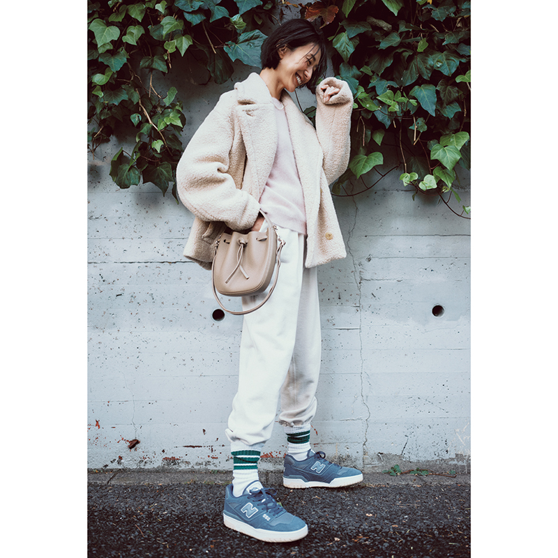 スニーカー[BB550 PHC]¥18,700(ニューバランス/ニューバランスジャパンお客様相談室)ボアコート¥96,800(ブリル/ブリル新宿)ピンクニット¥28,600(サロン アダム エ ロぺ)スウェットパンツ¥42,900(ATON/エイトン青山)ネックレス¥6,930(アビステ)バッグ¥44,000(VASIC/ヴァジックジャパン)ソックス¥1,452(ユナイテッドアスレ/キャブ)
