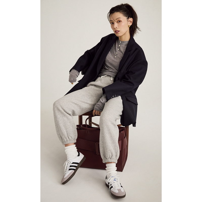 スニーカー¥15,400(アディダス オリジナルス/アディダスお客様窓口)ジャケット¥55,000 ソックス¥3,850※2pair(ともにthehighlights) ニット¥19,800(NKNIT) スウェットパンツ¥18,480(シンゾーン/シンゾーン 表参道本店) イヤリング¥15,400(ローラ ロンバルディ/八木通商) バッグ¥455,625(BOYY/エム)