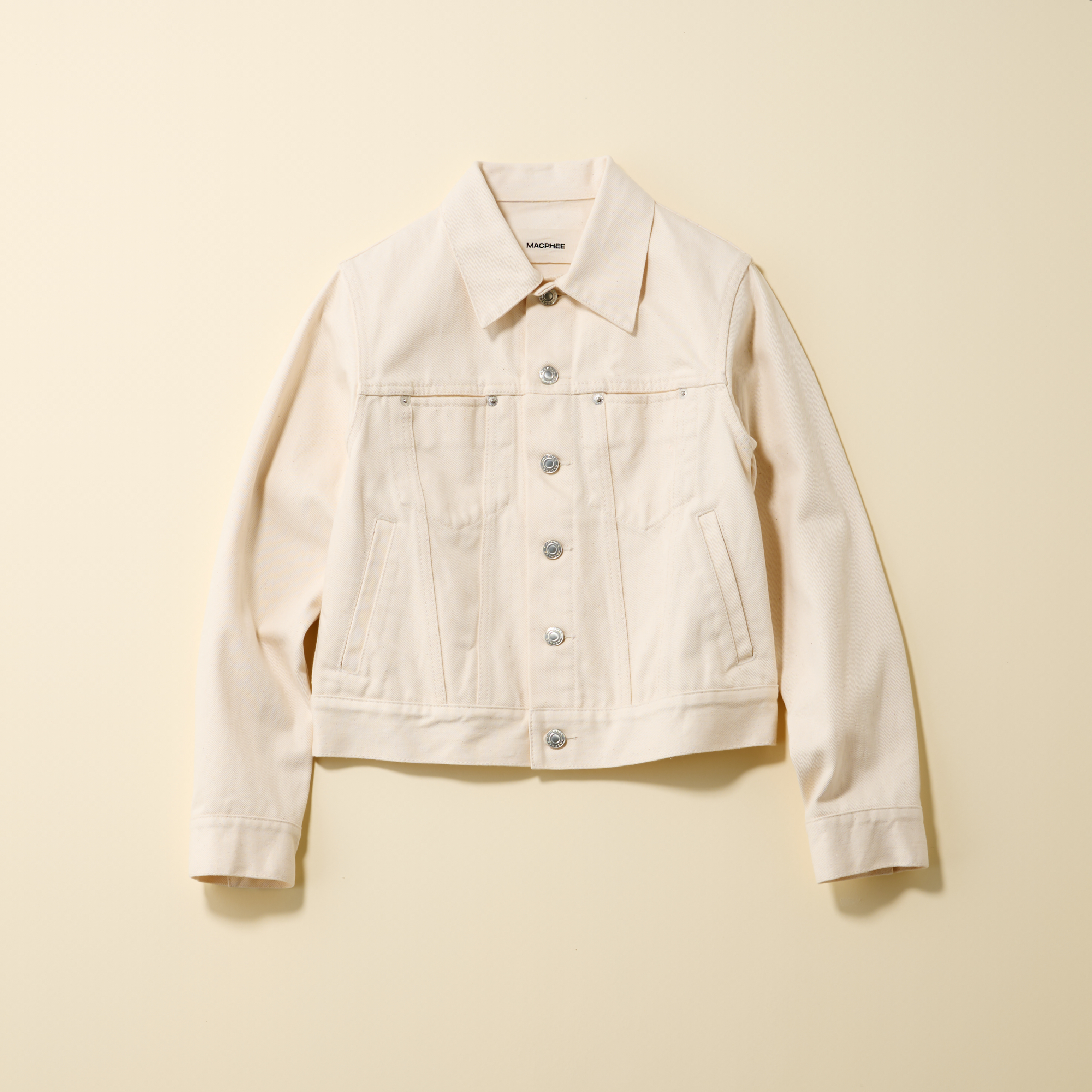 すっきりしたベーシックなデザインなので、カジュアルになりすぎずきれいめに着られるデニムジャケット。コンパクトシルエットでハイウエストパンツやボリュームスカートとの相性も良く、脚長効果も得られます。デニムジャケットには珍しく、脇ポケットが付いていて使いやすい。デニムジャケット¥30,800(MACPHEE/TOMORROWLAND)