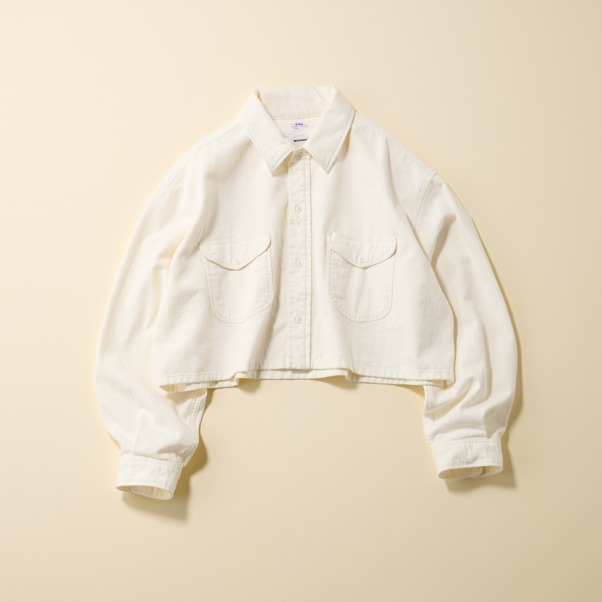 ペン挿し付き胸ポケット、二つ穴貝釦などトラディショナルなディテールを残した1950sの王道ワークシャツをベースに、ショート丈に落とし込んで今っぽいシルエットに。短丈なので着るだけでスタイルアップが叶います。生地が重くないので、着ていて疲れないことも魅力。デニムジャケット¥18,700(MIESROHE)