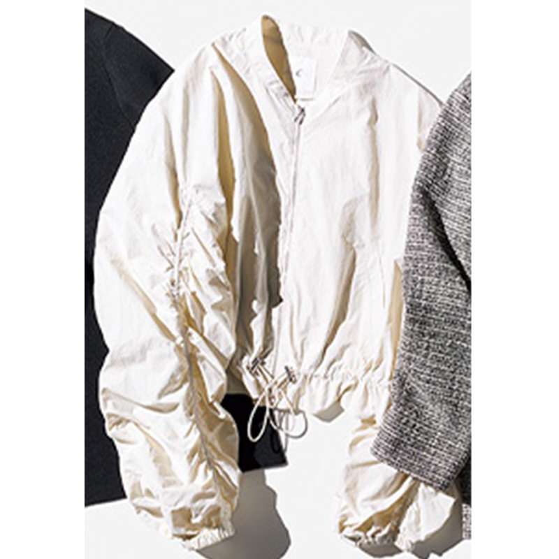 「撥水ナイロン素材で袖や裾のギャザーを絞れば甘くも着られる優秀デザイン」ブルゾン¥9,350(オペークドットクリップ)