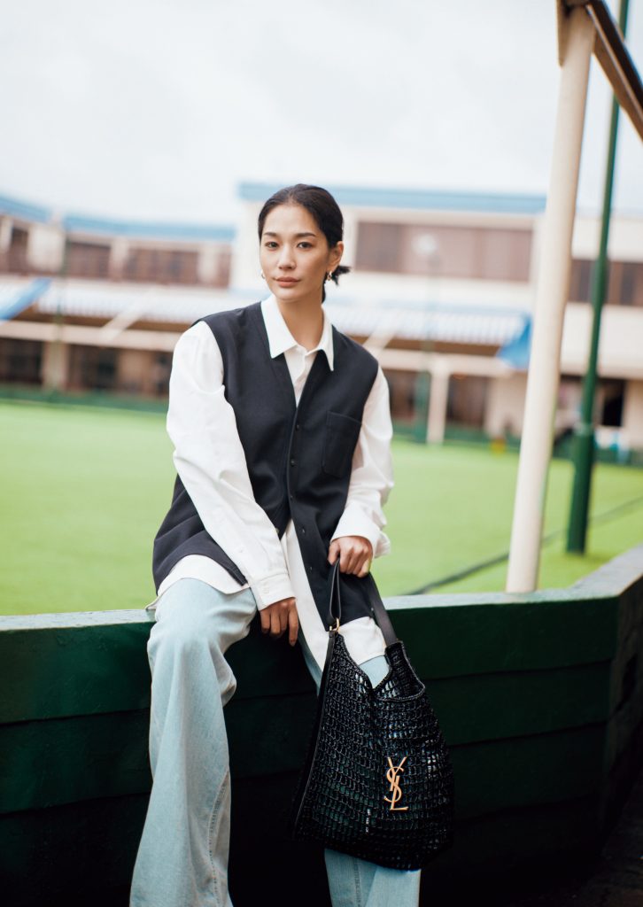 バッグ「カサンドラショルダーバッグ」[H40×W37×D3㎝]¥294,800(サンローラン バイ アンソニー・ヴァカレロ/サンローラン クライアントサービス)シャツ¥99,000ベスト¥66,000(ともにブラミンク)デニム¥41,800〈トゥエ モン トレゾア〉ピアス¥66,000〈オール ブルース〉(ともにエドストローム オフィス)