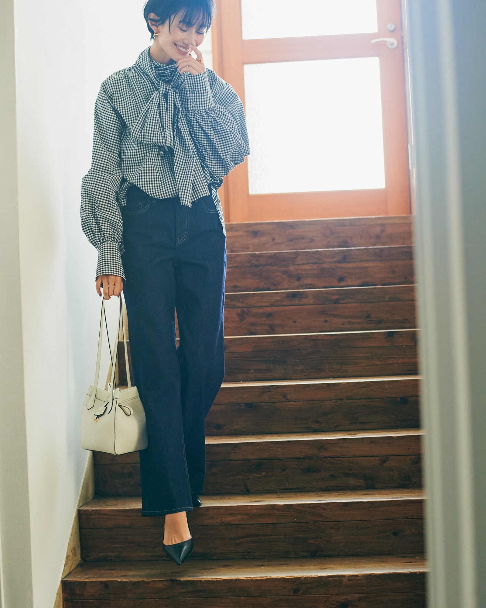 ギンガムチェック×ビッグボウタイの甘いブラウスは、デニムでカジュアルダウンするくらいが◎。トラッドな雰囲気が出て園や学校に似合います。デニムはユニクロ、ブラウスはウィム ガゼット、バッグはフェンディのもの。