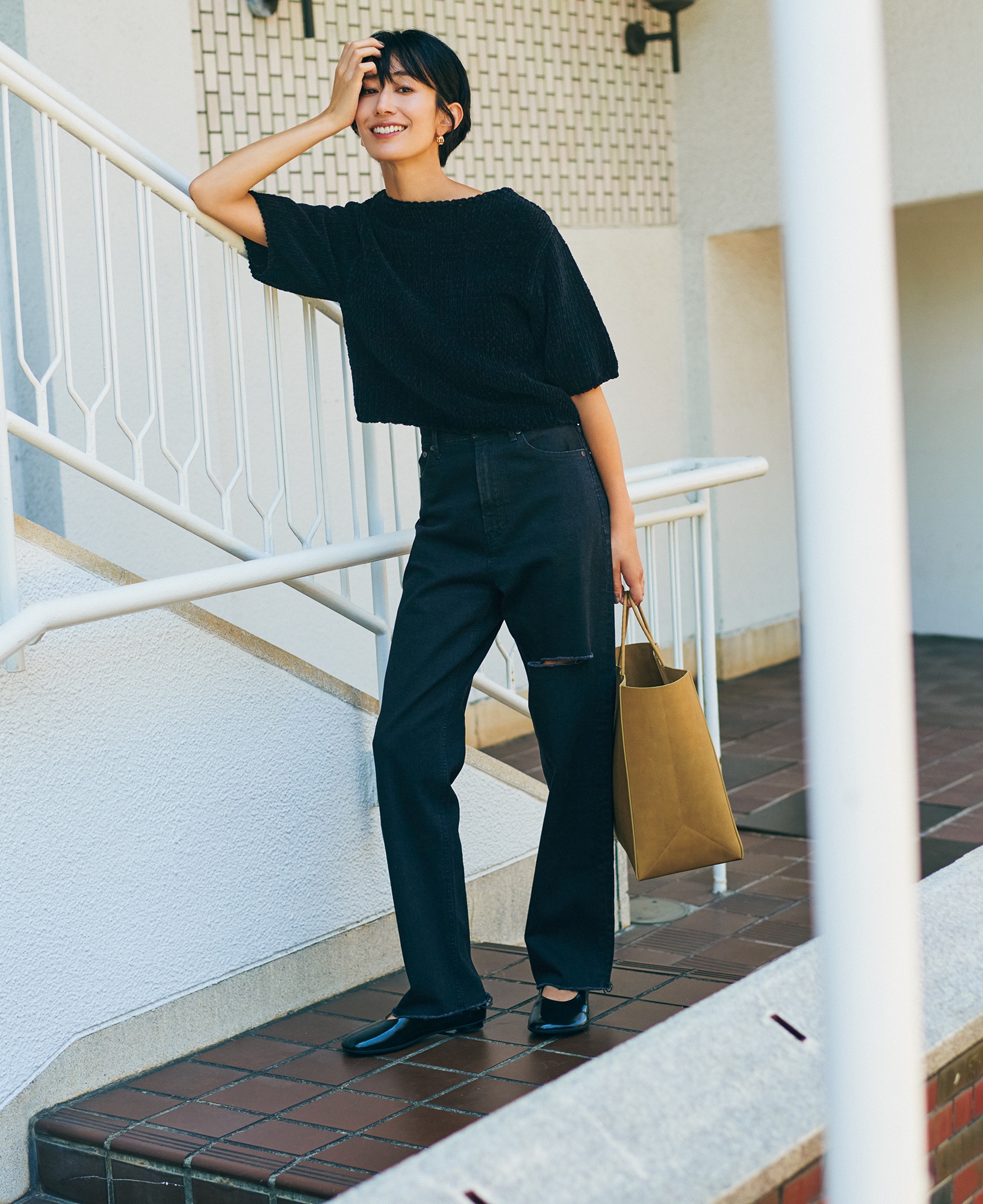 黒デニムに、キレイめプルオーバーと靴も黒で統一。デニムはヤヌーク 、トップスはエイチ ビューティー&ユース、パンプスとバッグはボッテガ・ヴェネタのもの。