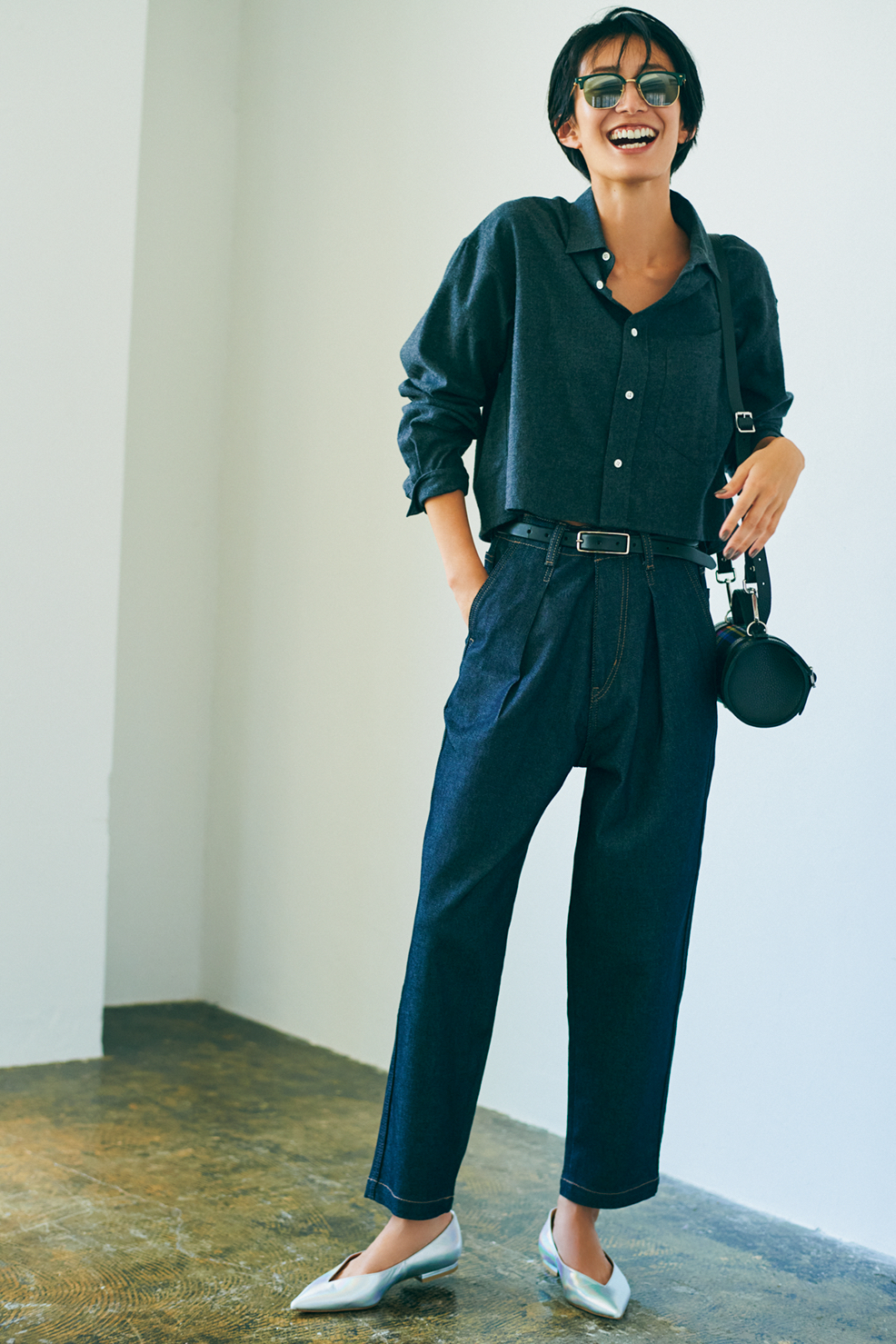 ネイビーシャツにネイビーデニムの組み合わせ。まじめになりがちなコーデも、デニムなら適度なリラックス感が出ます。デニムはUNIFIED Unlimited(ユニファイド アンリミテッド)、シャツはヤヌーク、パンプスはピッピシックのもの。