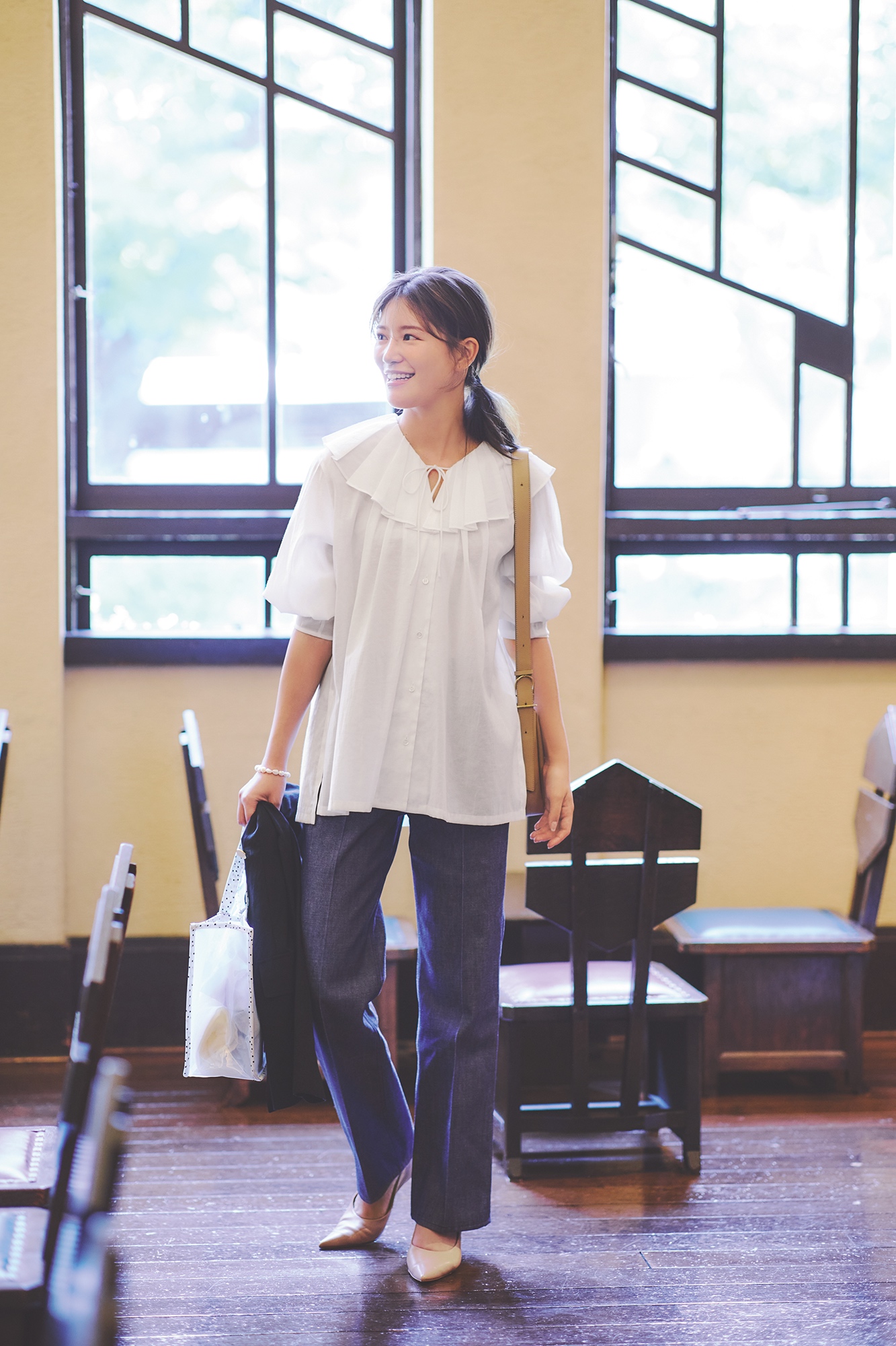 定番の白ブラウスも黒パンツではなくネイビーデニムを合わせることで新鮮に。デニムは、ウォッシュが少なく、センタープレス入りなどのデザインを選ぶと安心です。デニムはサードマガジン、ブラウスはデパリエのもの。