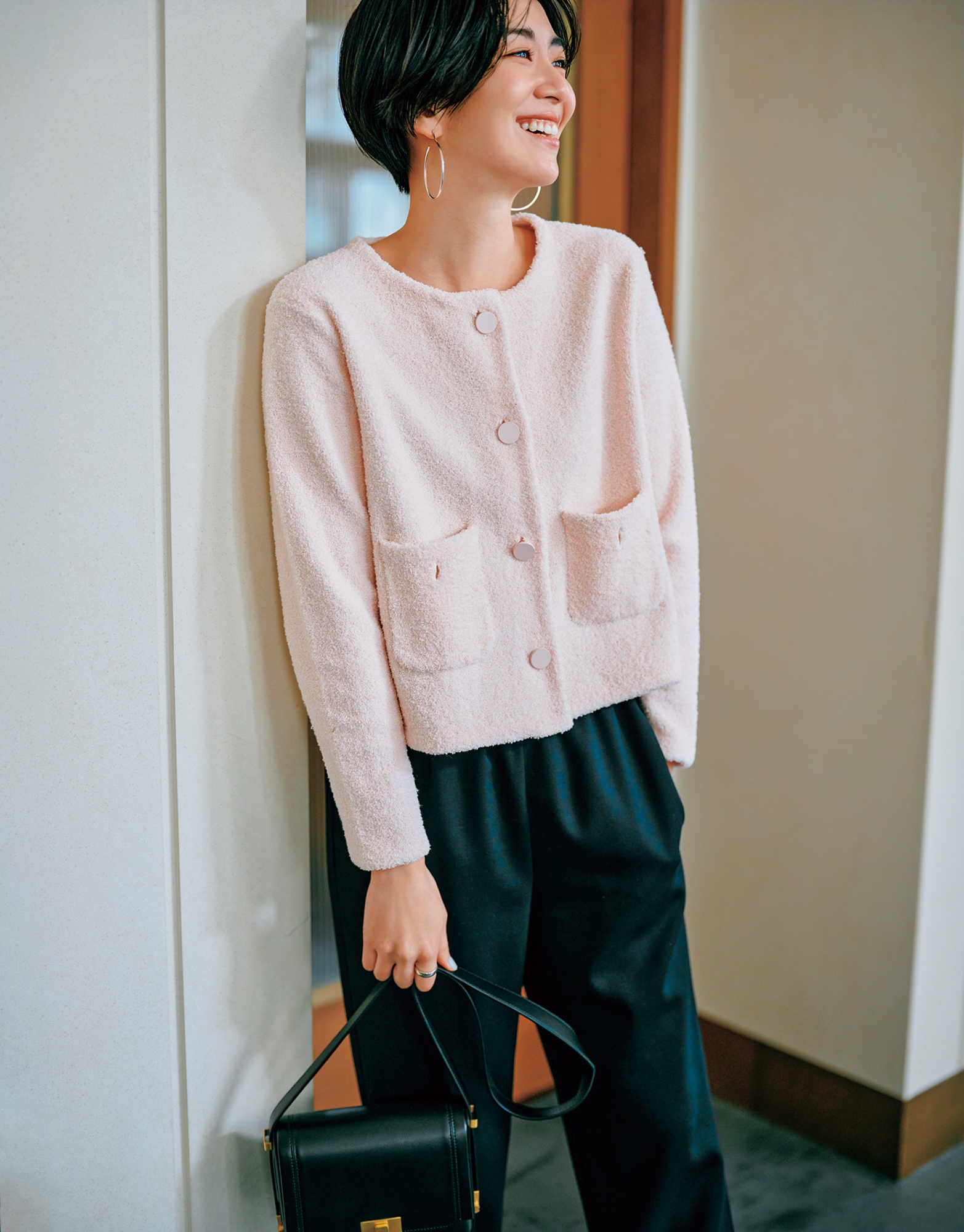 パイル地でジャケットというのが新鮮。薄ピンクの甘いカラーもこの素材なら照れずに着られそうです。ジャケットはサードマガジン、パンツはデ・プレ。