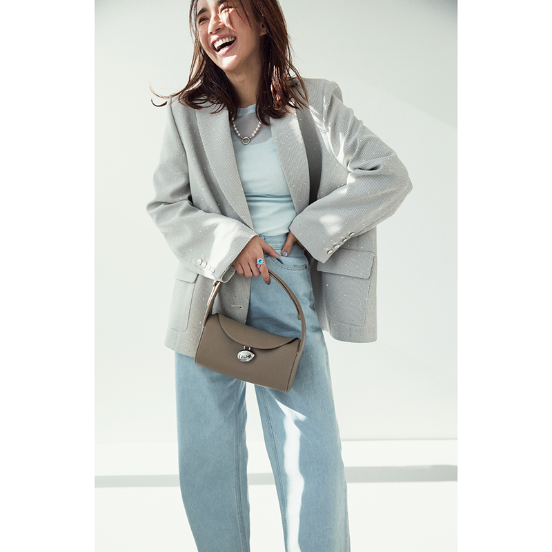 ジャケットを羽織ればデニムでもきちんと見えます。全体的に淡いカラーでエレガントな印象も。ジャケットはカデュネ、インナーはシールームリン、デニムはザ ハンサム、バッグはカフネ。