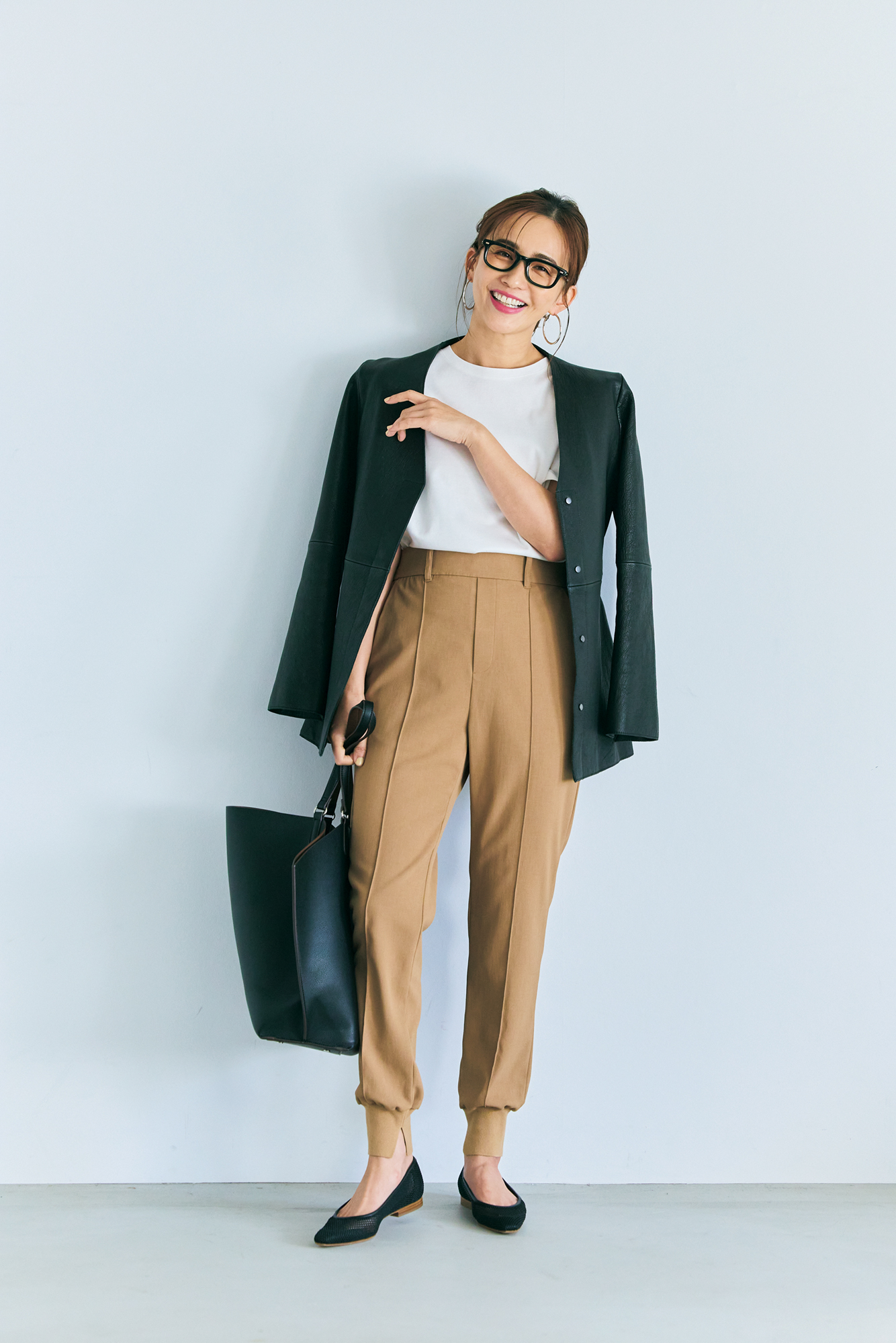 ジョグパンスタイルがジャケット効果でグッときれいめに。パンツはティーチ、ジャケットはウィム ガゼット、バッグはアンドミューク。