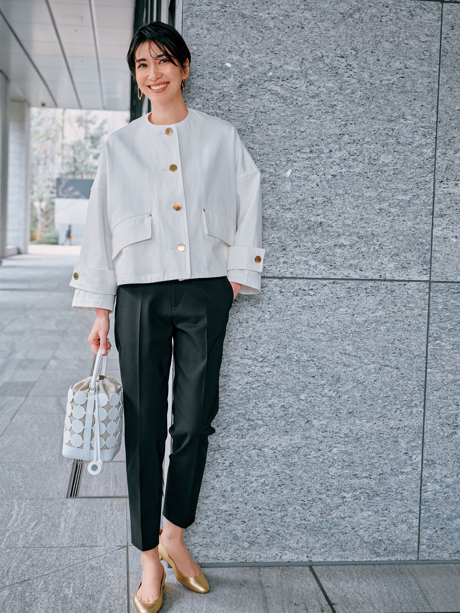 ウエストのベルトデザインが効いたゆるパンツに、かっちりジャケットでほんのりモードに。ジャケットとパンツはチノ、バッグはメゾン カナウ。