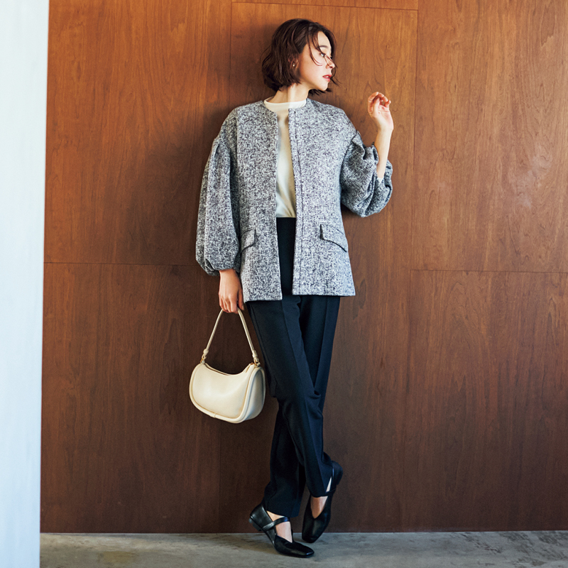 クールなモノトーン柄も、ノーカラーとバルーン袖で優しげに。ボトムスを選ばない丈が使いやすそう。ジャケット、ブラウス、バッグ、靴はすべてミラ オーウェン。