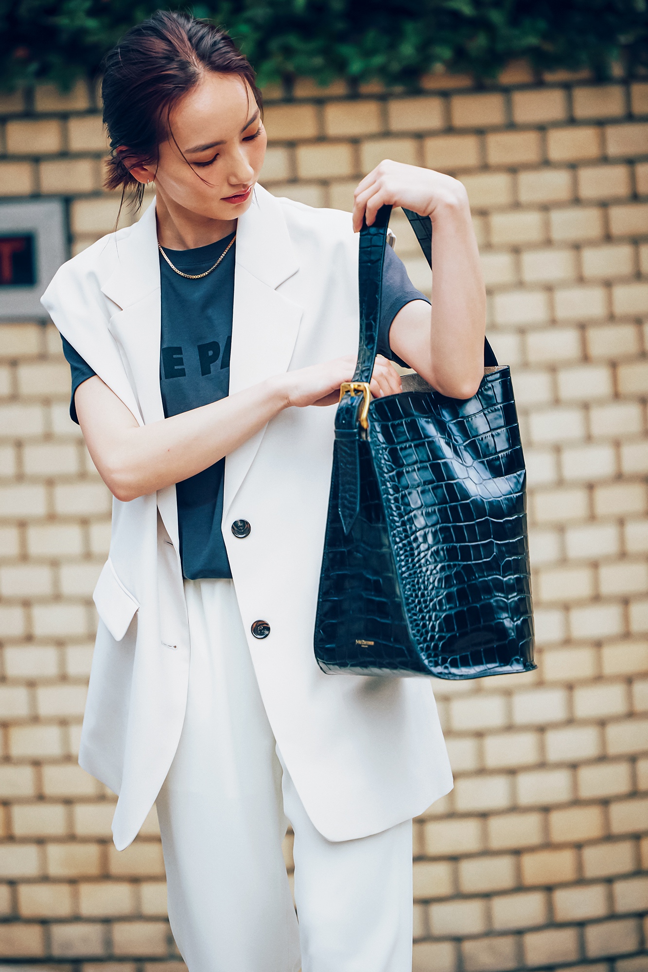 ジレとパンツを白で統一した清楚なコーデは、インナーをグレーのロゴTにして少し着崩してもOK。ジレはGU、パンツはカデュネ、Tシャツはザ ポーズ、バッグはJ&Mデヴィッドソンのもの。