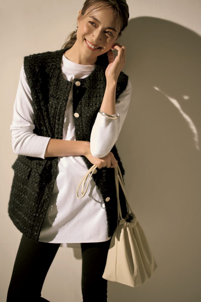 参観日には華やかなツイードジレをロンTにサラッと羽織るくらいが似合います。ジレはイウエン マトフ、カットソーはエイトン、パンツはユニクロ、バッグはモダン ウィーヴィングのもの。