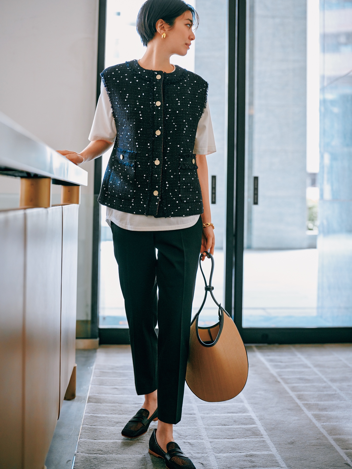 前のボタンを閉じて着ると、ツイードジレの華やかさを存分に活かせます。Tシャツとパンツがユニクロのコスパなコーデが一気に高見え。ジレはエブール、靴はピッピシック、バッグはヴァジックのもの。