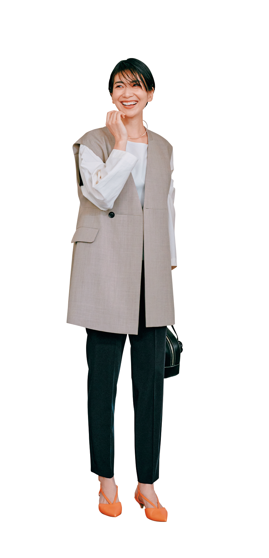 ハイウエストの切り替えや1つボタンなど、シンプルながら技の効いたデザインのジレ。膝丈の長めなら脱がないアウターとしても活躍します。ジレはニアーニッポン、Tシャツはプルミエ アロンディスモン、パンツはグリーンレーベルリラクシング、パンプスはネブローニのもの。