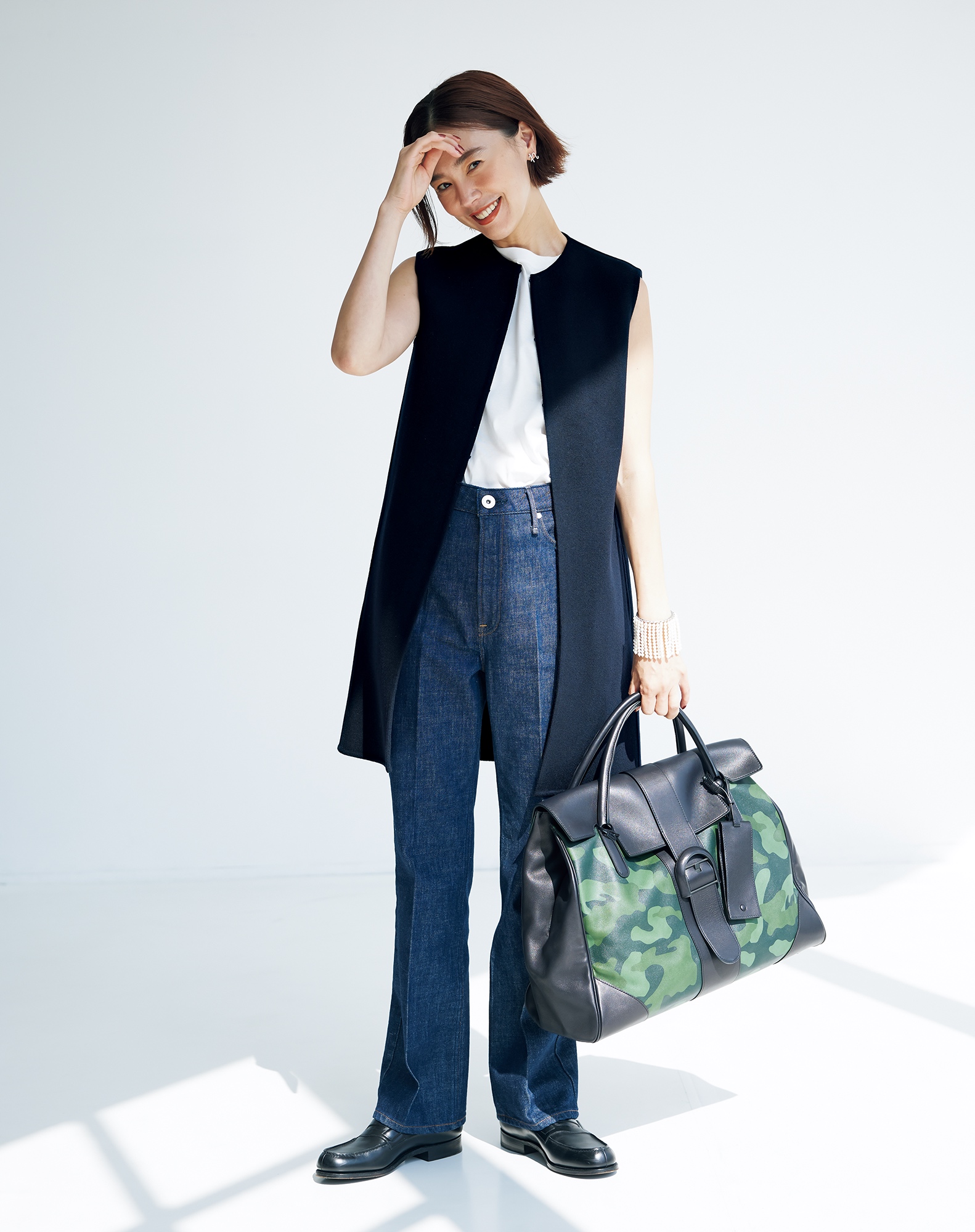 デニムスタイルもネイビーのジレでまじめに。お尻まですっぽり隠れる丈は安心感があります。ジレはマディソンブルー、デニムはアッパーハイツ、タンクトップはスローン、靴はジェイエムウェストン、バッグはデルヴォーのもの。