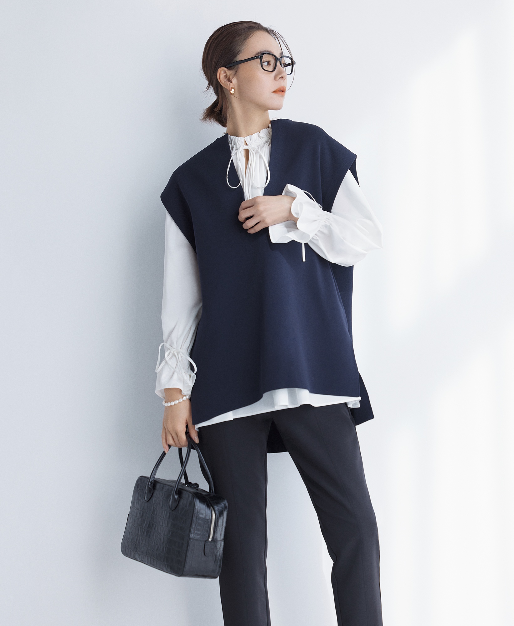 サラリと着られるかぶりタイプもおすすめ。甘いブラウスをインしてもしつこくなりません。ジレ、ブラウス、パンツは23区、バッグはロウナー ロンドンのもの。