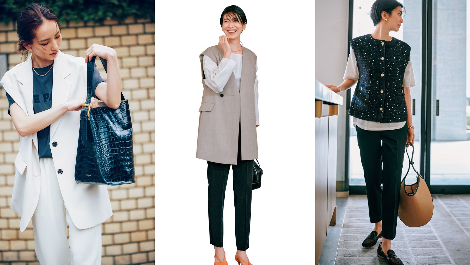 数年前に人気に火がつき、今では定番アイテムとして君臨しているジレ。短丈から長め丈、主役デザインからサラッと羽織れるものまで、ラインナップが豊富になっています。シンプルなパンツスタイルを清楚に盛り上げてくれること間違いなし!