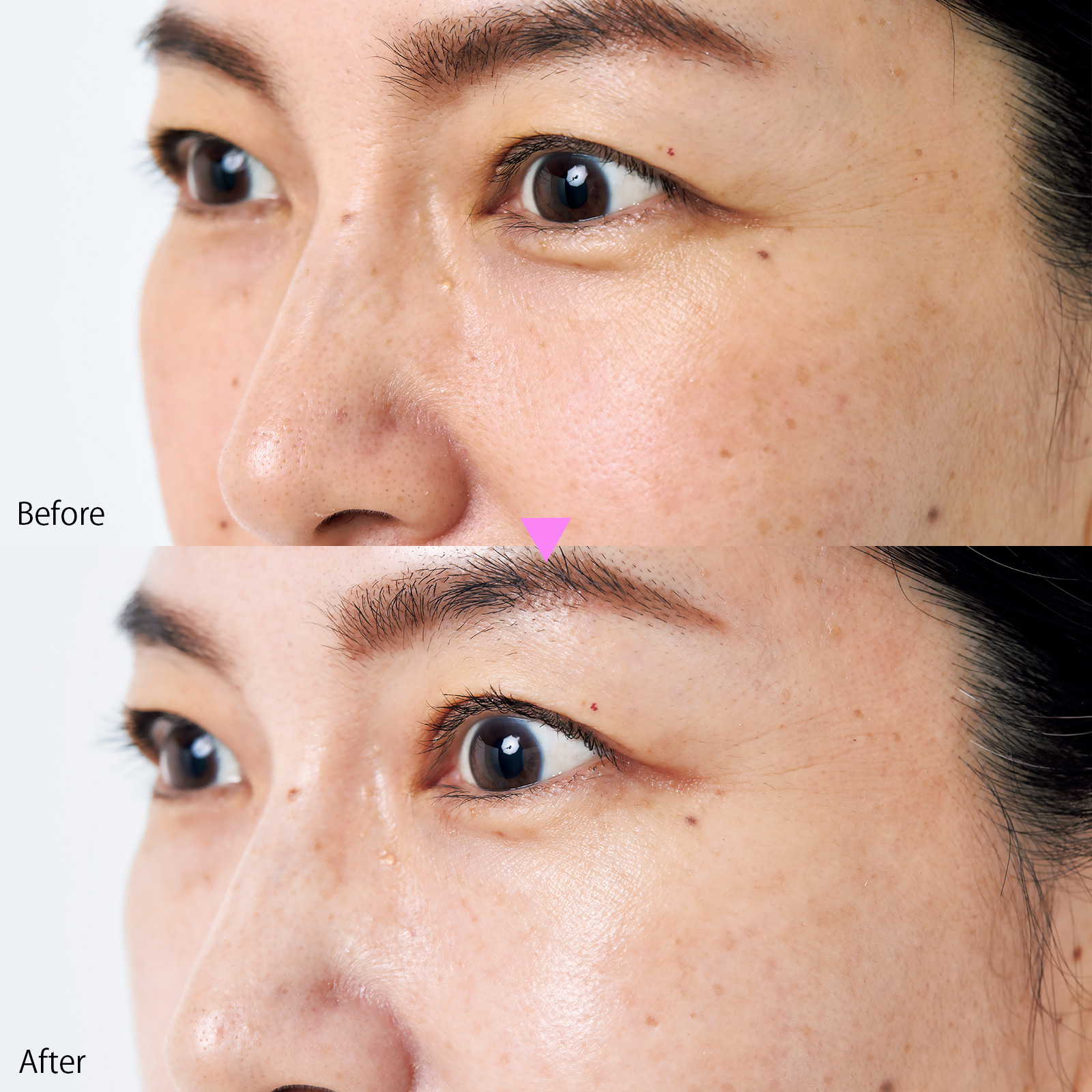 目の周りのくすみが軽減し、頰のシミも薄くなった印象。ワントーンアップしたツヤ肌に。