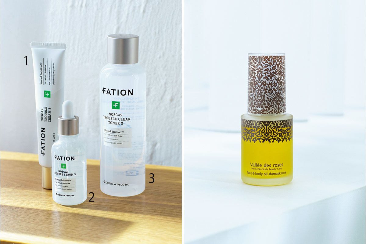 左/韓国シェアNo.1 医薬品メーカー発トラブル肌向けコスメ。1.パティオン ノスカナイン トラブル クリーム S 45ml ¥3,630、2.同セラム S 30ml ¥2,640、3.同トナー S 200ml ¥ 2,530(すべてPAGE-ONER)