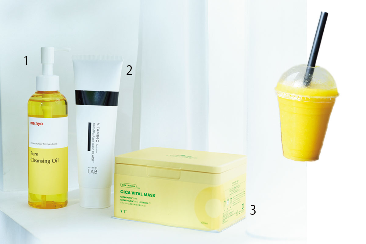 洗顔は肌状態で使い分け。しっかりオフできる酵素系が基本。デイリー使いのシートマスクは惜しみなく使えるシャバシャバ系を。代謝アップにはマンゴースムージーをオーダー。