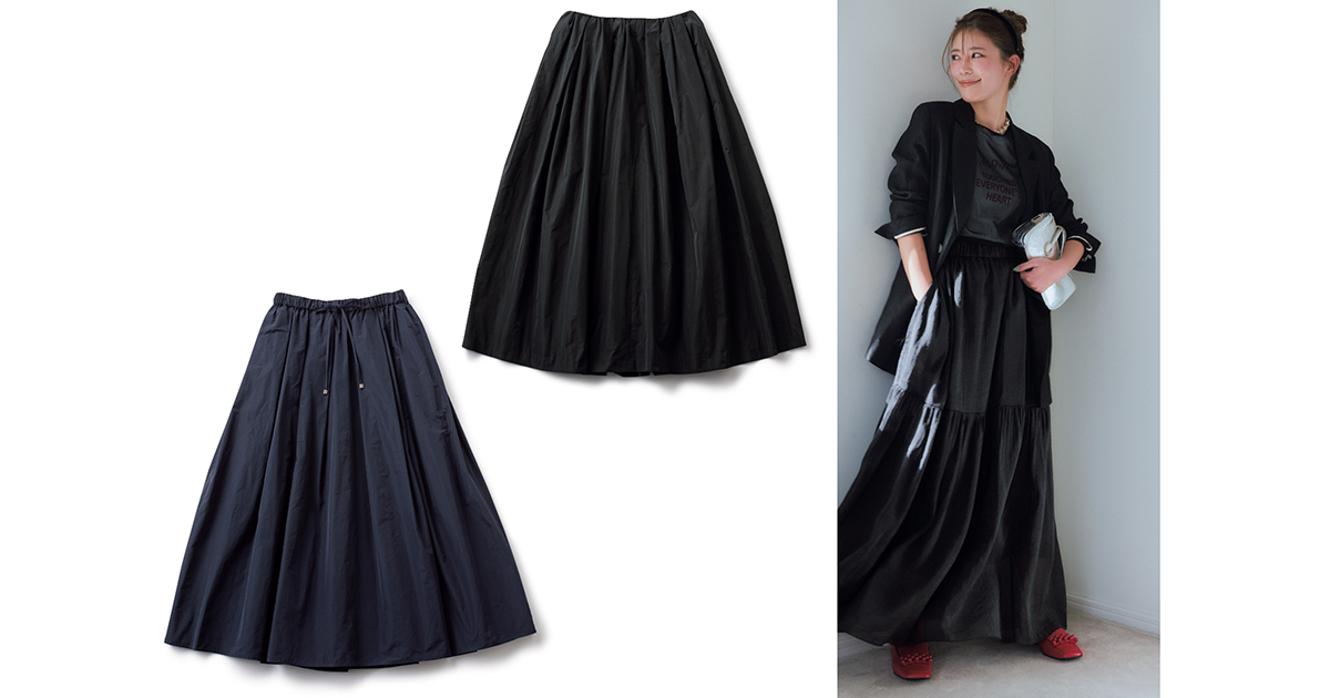 この春はいつもの送迎服をちょっとアップデートしたい──園や学校の暗黙ルールがわかってきたママにおすすめなのが今季トレンドのふんわりロングスカート。手に取りやすい黒と紺でお届けします。