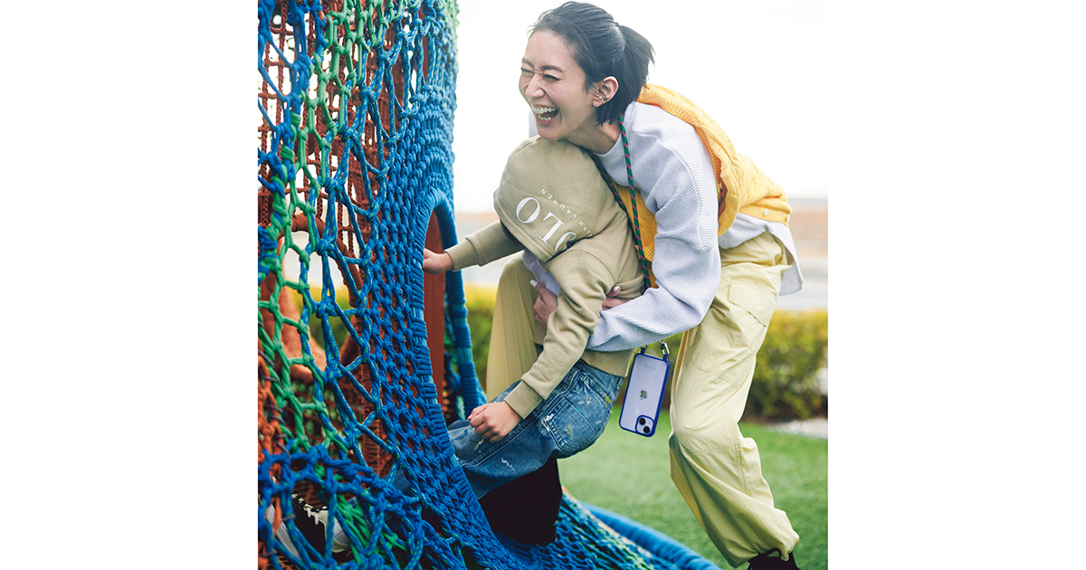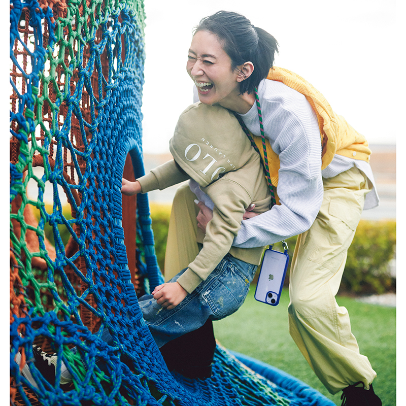 ママ◇パンツ¥28,600(ティッカ)肩に巻いたニット¥29,700(ポロ ラルフ ローレン/ラルフ ローレン)プルオーバー¥19,800(サードマガジン)ブーツ¥60,500(ダブルスタンダードクロージング/フィルム)携帯ケース¥2,860 ストラップ¥4,400(ともにトポロジー/トポロジー フラッグシップ ショップ)キッズ◇スウェット¥16,500 パンツ¥26,400(ともにポロ ラルフ ローレン/ラルフ ローレン)シューズ¥5,590(ザラ/ザラ カスタマーサービス)