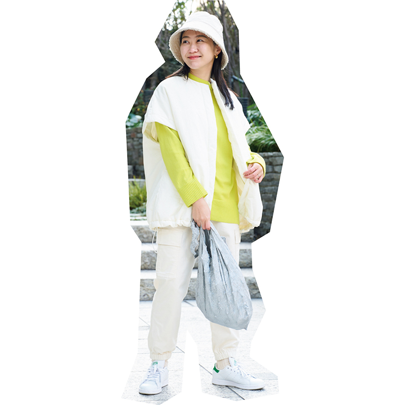 キャップ¥4,400(フォーティーセブン)スウェット¥19,800(ギャルリー・ヴィー/ギャルリー・ヴィー 丸の内店)腰に巻いたシャツ¥25,300(ブラームス/ワンダリズム)パンツ¥23,100(ポロ ラルフ ローレン/ラルフ ローレン)トートバッグ¥37,950(フランソワ レニエ/ヤマニ)パールバッグ¥7,480(バーセルフ)スニーカー¥26,400(コール ハーン×エミ/エミ ニュウマン新宿店)ネックレス¥27,500(メラキ/フラッパーズ)