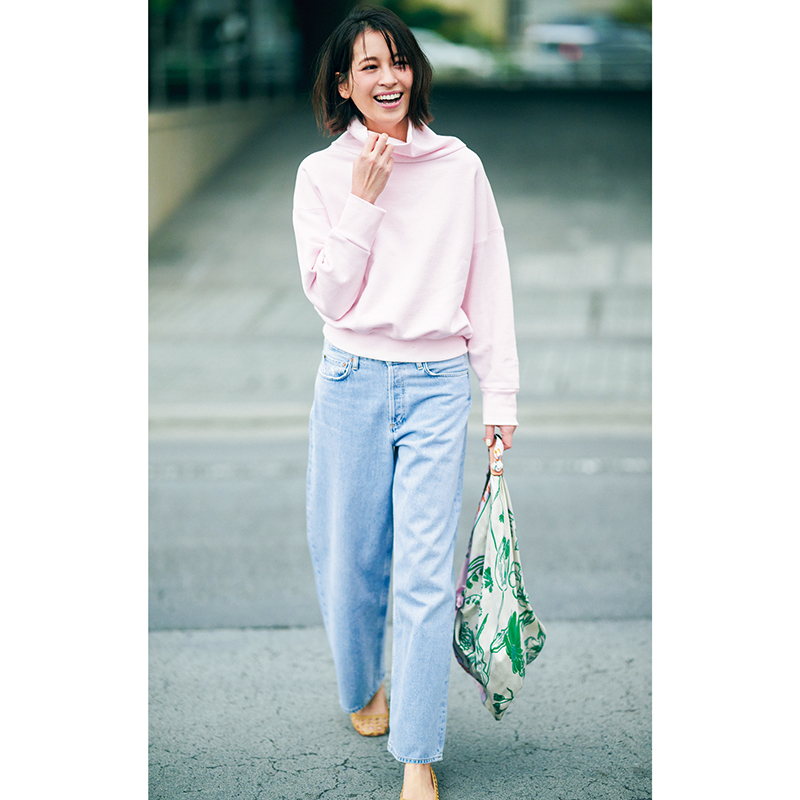王道のスウェット×デニムスタイルこそ、選ぶカラーリングで印象が激変。絶対的に可愛さが光るピンクも、カジュアルなスウェットなら気負わずに着られるという見方も。かなり淡いトーンがヘルシーな印象を後押し。今年らしいゆるっとしたシルエットのデニムも、水色パンツ感覚で穿ける淡い色味を選べば、カラーONカラーでも好バランス。