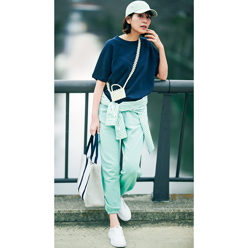日差し隠しにマストなキャップやスウェットパンツも大胆にミントを選択し、メンズライク感をマイナス。色リンクさせたストライプシャツを腰巻きしたら、リラクシー感はそのままに、ちょっぴりキレイめに。