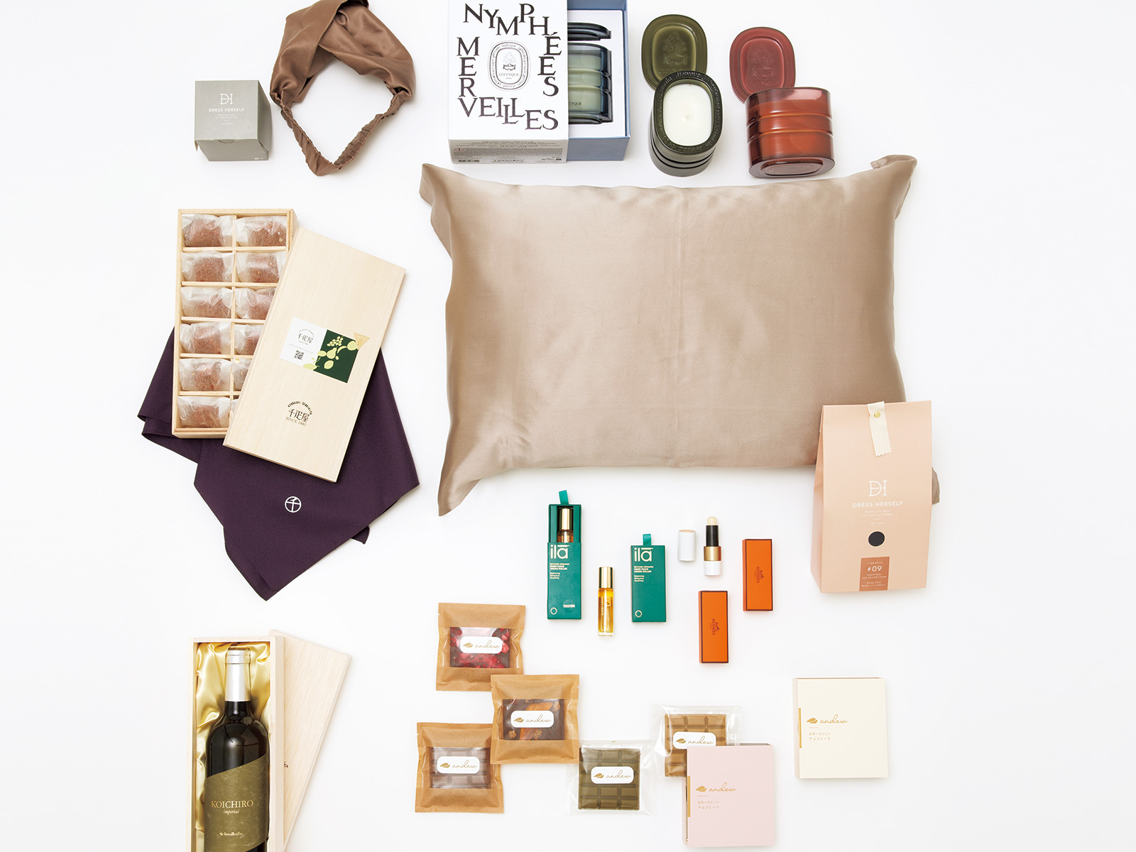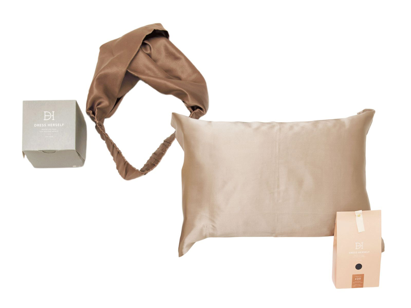 右/「ナイトツール/シルクピローカバー」[53×72cm]¥4,950 (ともにDRESS HERSELF)