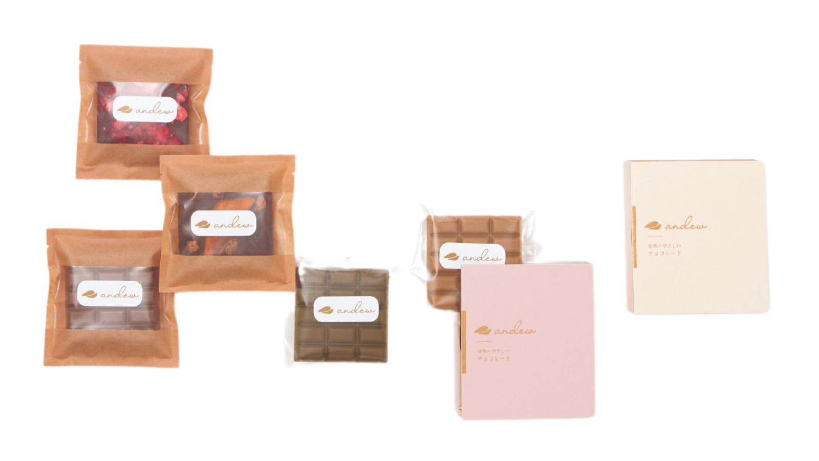 左「andewタブレット(北海道ミルクチョコレート/フルーツ/抹茶/きなこ)」各¥980「同(いちご)」¥1,200 「とろける生チョコレート」¥4,000(世界一やさしいチョコレートandew)