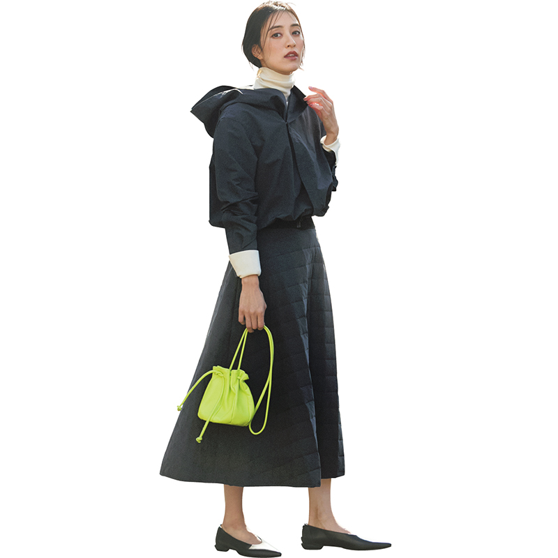 ブルゾン¥53,900(アカネ ウツノミヤ)タートルニット¥36,900(ティーチ)スカート¥49,500(サードマガジン×ミコモリ/サードマガジン)バッグ¥22,000(ノマディス/ノーベルバ)靴¥35,200(シーセイ/アイネックス)