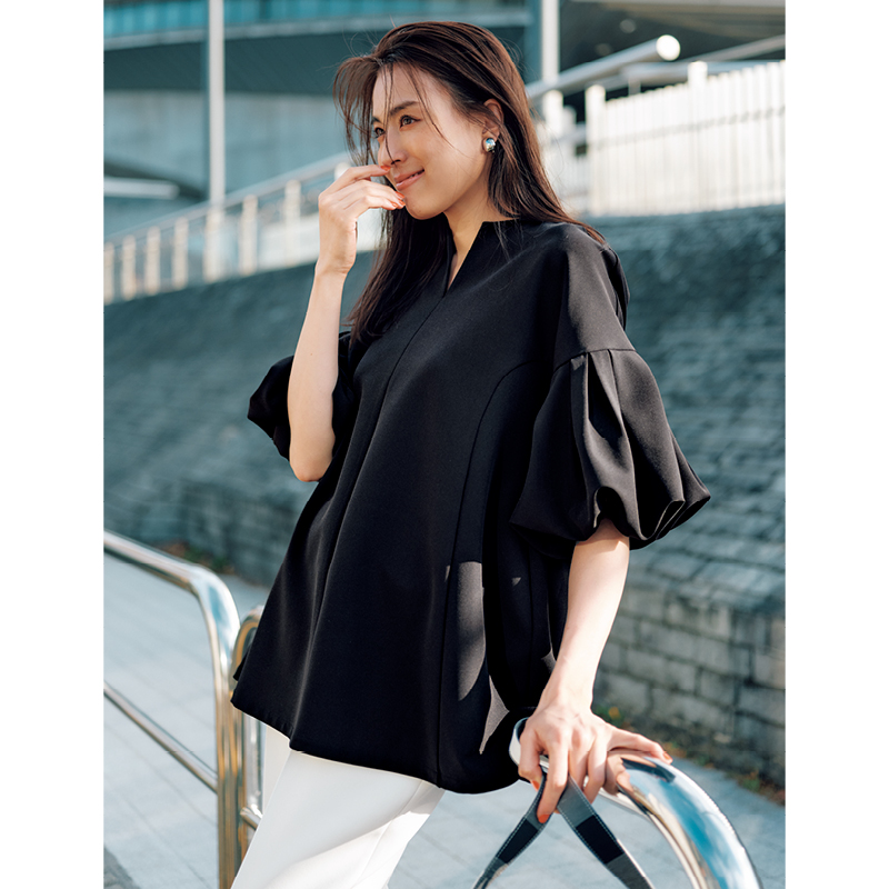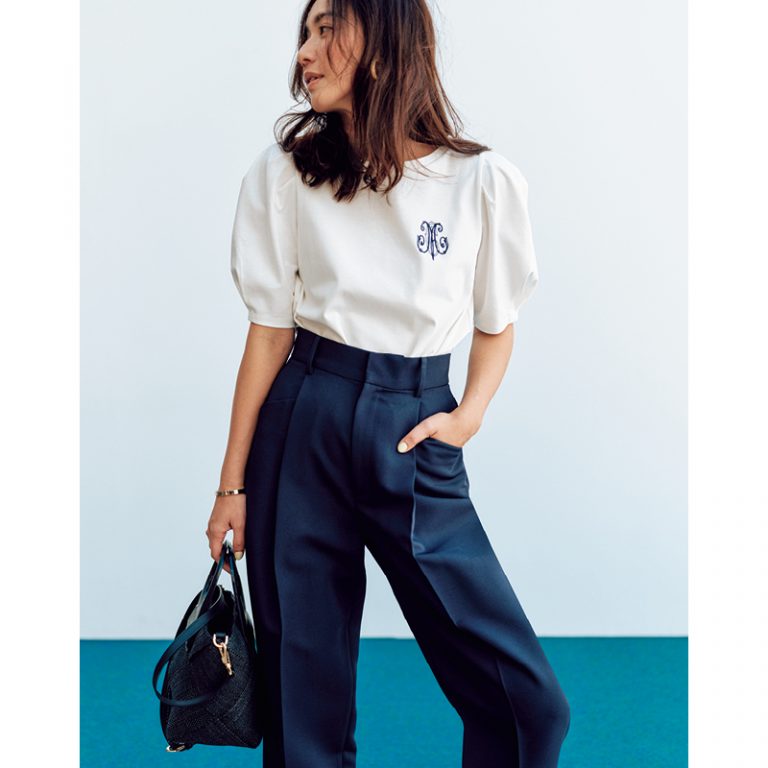 カットソー¥17,600(マーリエ ル カセット/フランドル)パンツ¥17,930(アンクレイヴ スタンダード/オンワード樫山)イヤリング¥6,090 バングル¥7,560(ともにアビステ)バッグ¥20,900(ヴィオラドーロ/ピーチ)