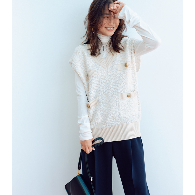 ベスト¥16,500(エウクレイド)トップス¥19,800(ATON/エイトン青山)パンツ¥19,910(アンクレイヴ スタンダード/オンワード樫山)ピアス¥8,400(アビステ) バッグ 参考商品(VERY STORE Selection)