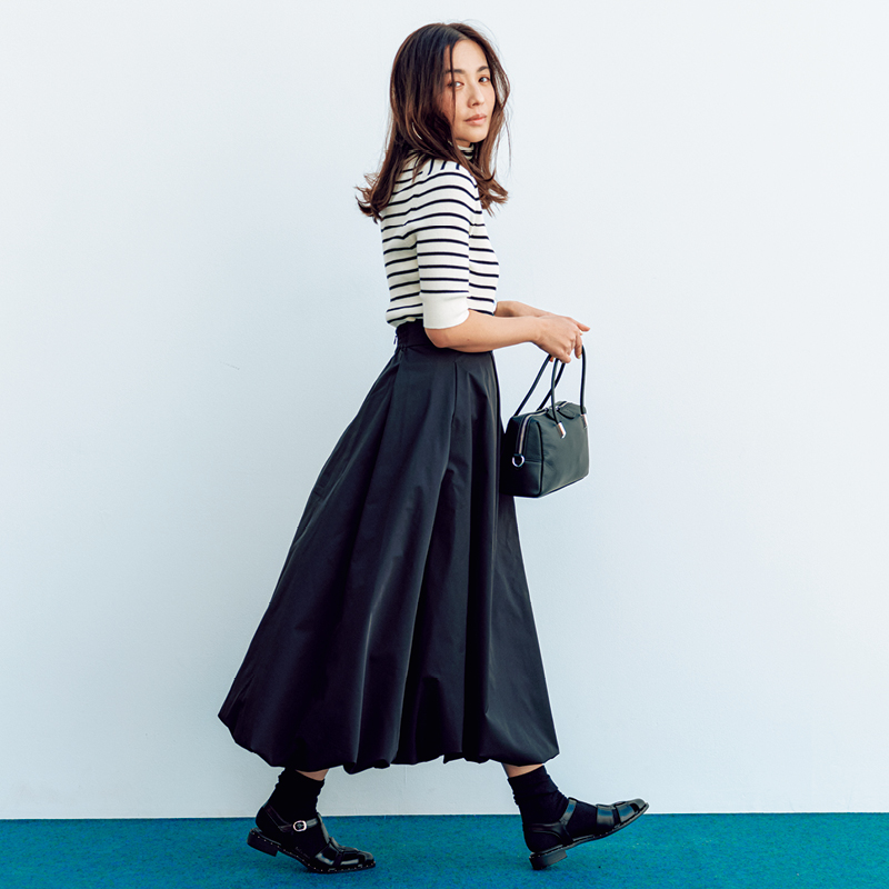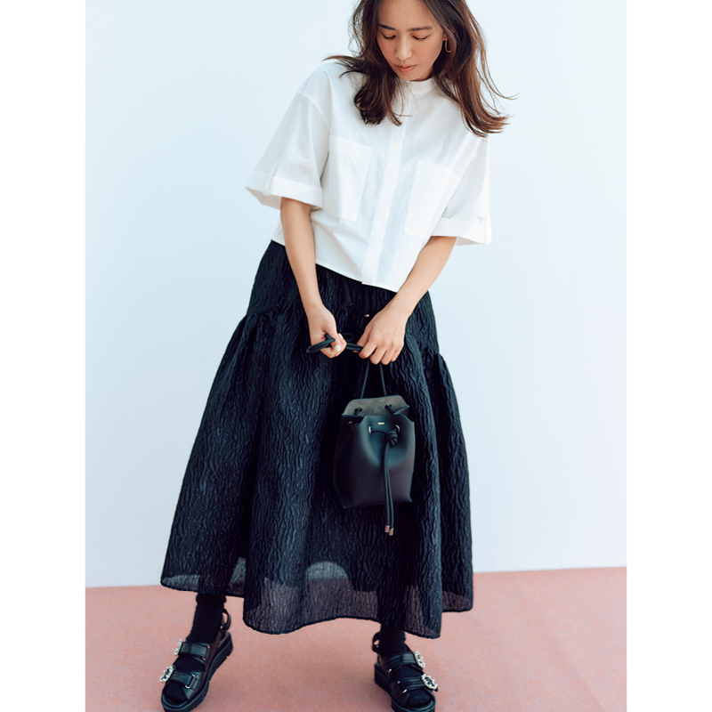 スカート¥18,700(エウクレイド)シャツ¥17,930(アンクレイヴ ホワイト/オンワード樫山)ピアス¥69,300(ウノアエレ/ウノアエレ ジャパン)バッグ¥52,800(FARO/BRIEFING 丸ビル店)サンダル¥18,700(ダイアナ/ダイアナ 銀座本店)ソックス/スタイリスト私物