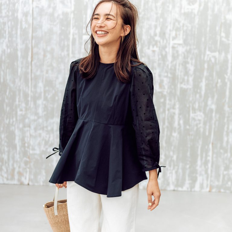 ブラウス¥16,500(スリースクエア) パンツ¥28,600(ダブルスタンダードクロージング/フィルム) バッグ¥17,600(ツル バイ マリコ オイカワ) イヤリング¥5,250(アビステ)) バッグ¥15,400(VERY STORE Selection)サンダル¥19,800(ダイアナ/ダイアナ 銀座本店)ソックス/スタイリスト私物