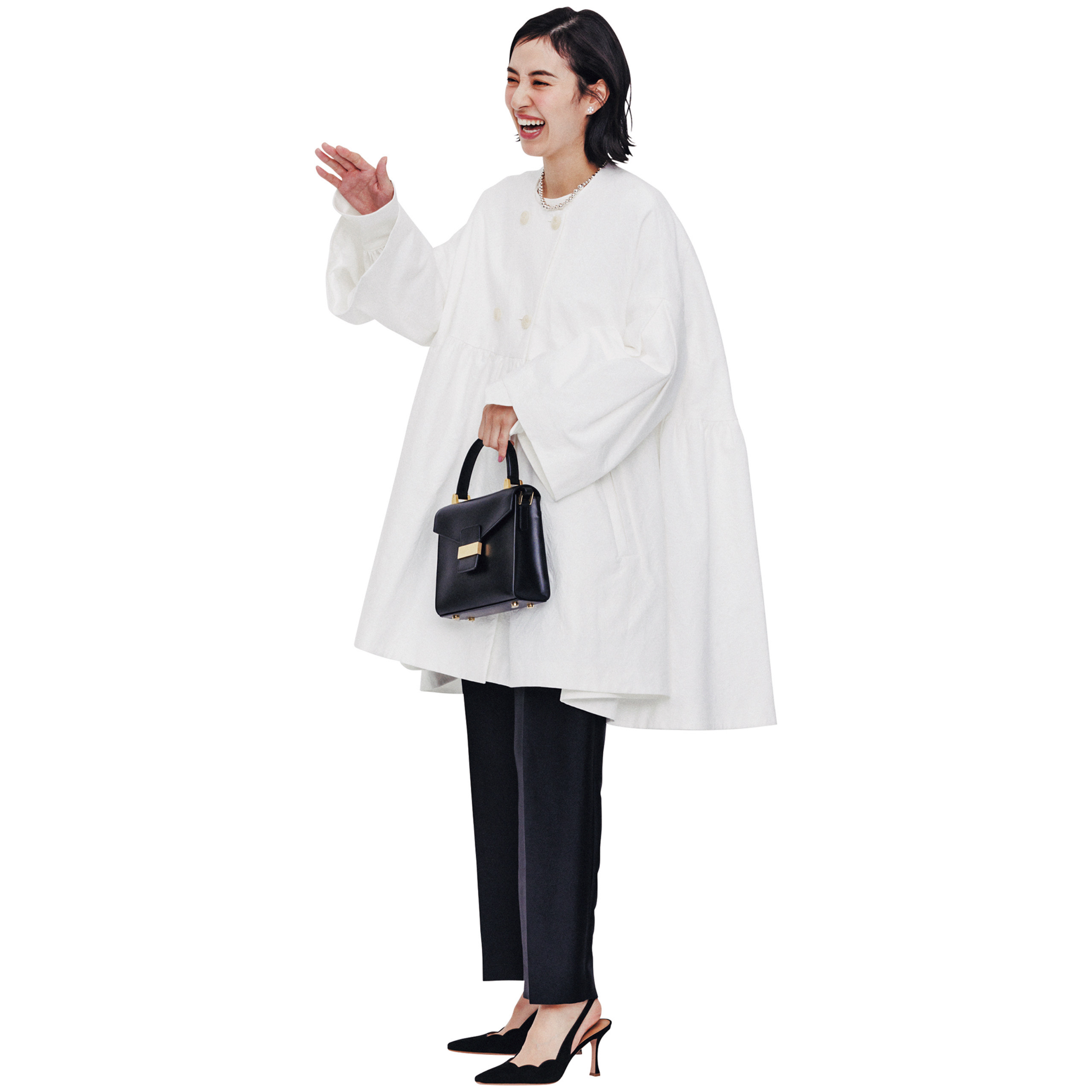 たっぷりな生地感とボリュームで、羽織るだけでサマになる主役アウター。ジャカードなのでのっぺり見えない白です。アウターはコラム、パンツはセテンス、靴はペリーコ、バッグはセルジオ ロッシ。