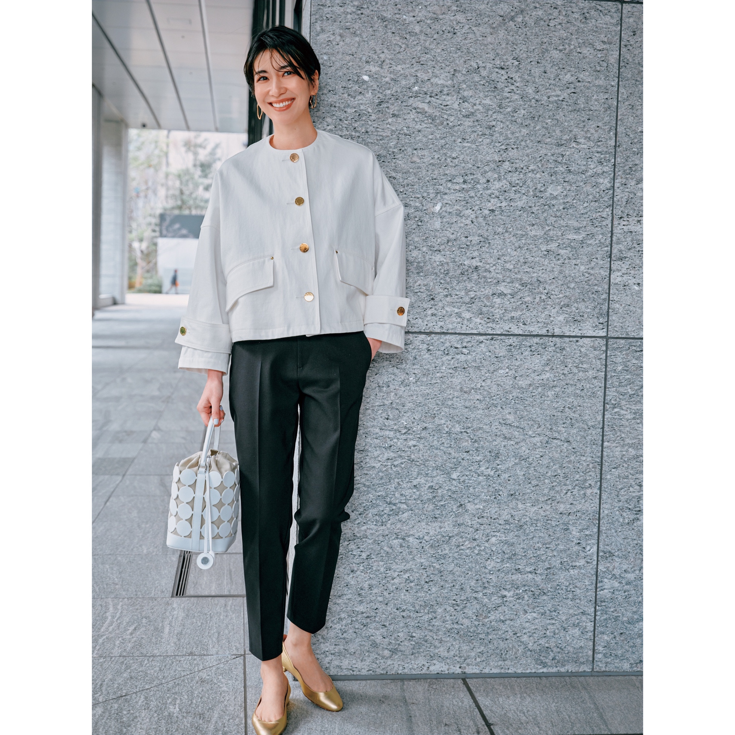 着るだけできちんと見えるノーカラーのジャケット。マッキントッシュから登場した金ボタンのタイプは華やかで、いろいろなボトムスに似合う短丈なのも魅力的。VERY本誌でもたくさん紹介されています。