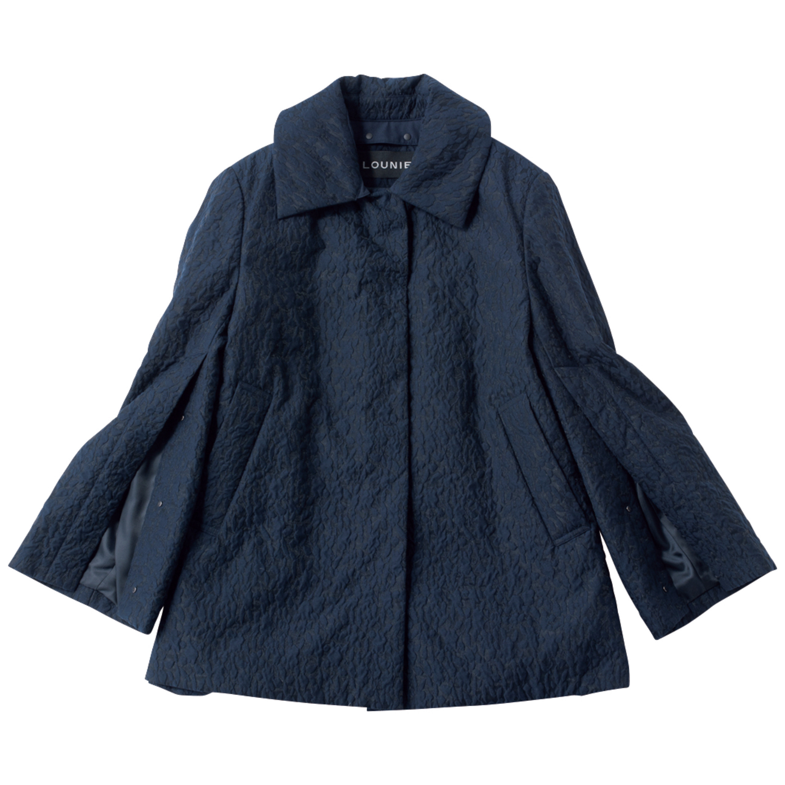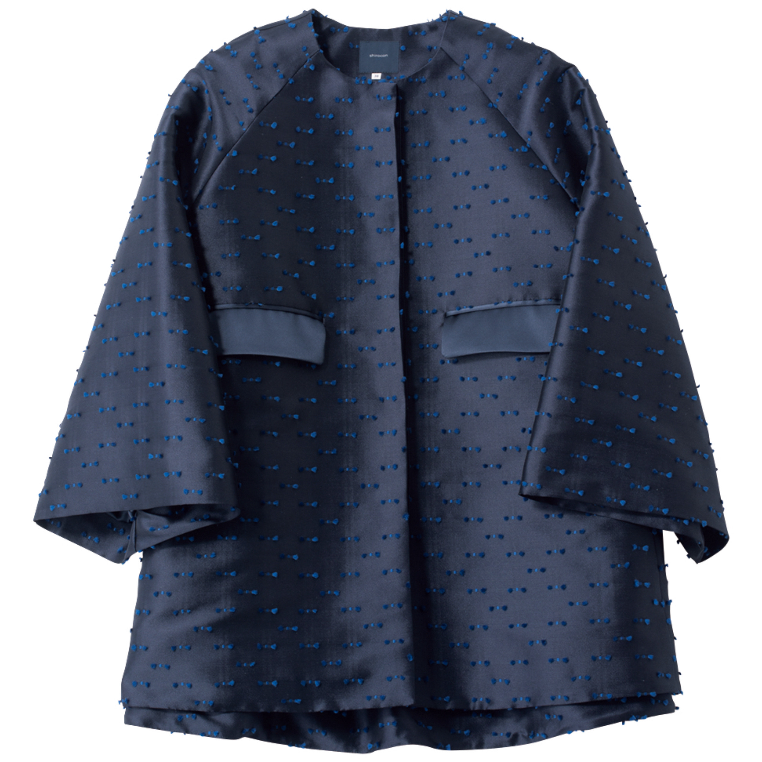 開閉可能の袖スリットから、インナーをチラ見せできるポンチョ風デザイン。ジャカードなので、オールネイビーでも華やかです。アウターはルーニィ。