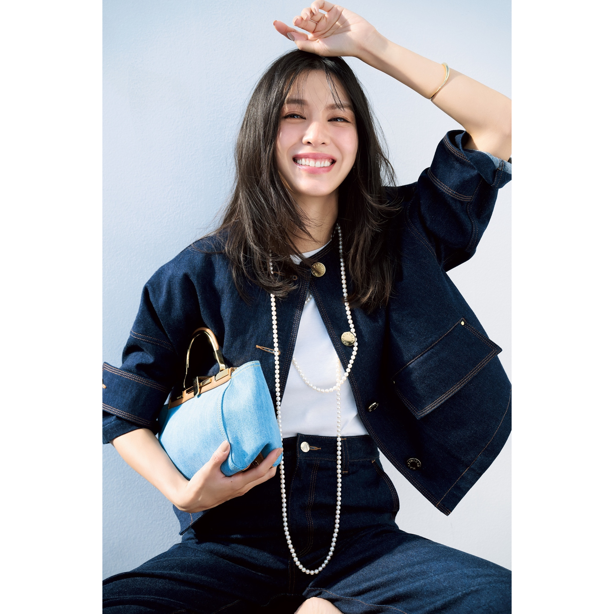 大トレンドのデニムジャケットはノーカラーで変化球。濃いめなので通勤コーデにも似合います。ジャケットとパンツはマッキントッシュ、バッグはザンケッティ。