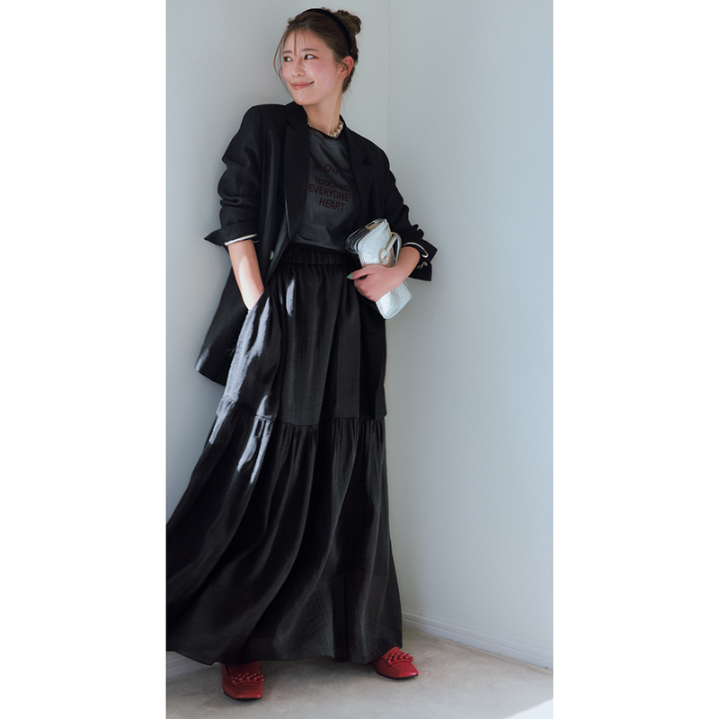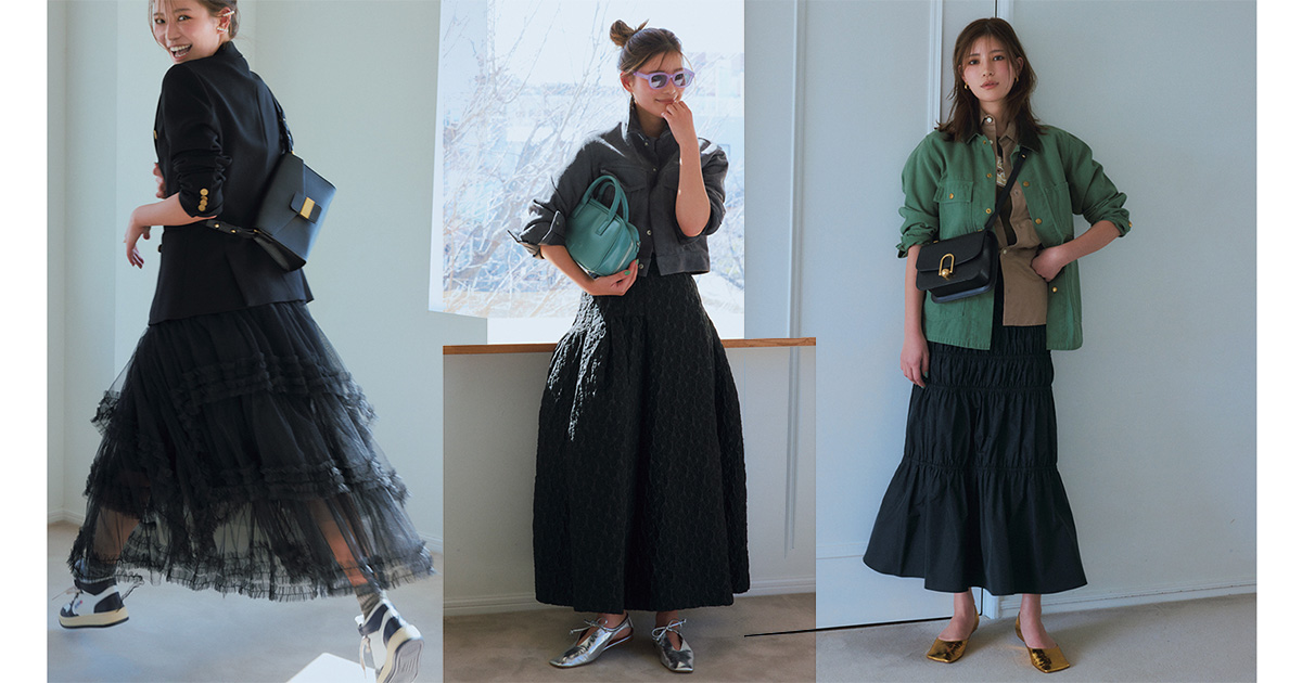 この春、復職ママも入園入学ママもドラマティックなふんわりスカートで華やかコーデに仕上げるのが気分。パンツでは味わえない特別感で、新生活ももっと楽しく。着回しやすい黒や紺のロングスカートをお届けします♡