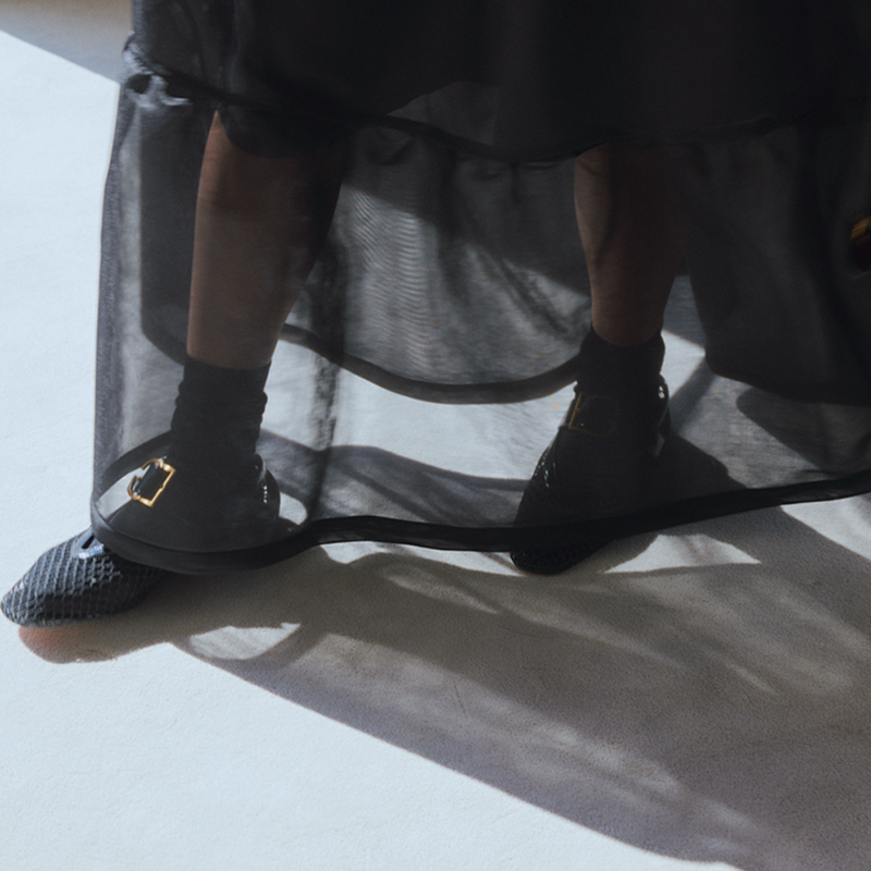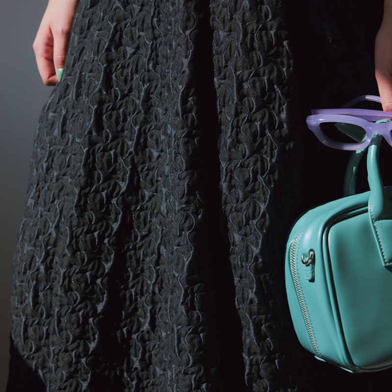 オーガンザのような透け感と肉厚なハリを併せ持った生地が歩くたびに弾んでドラマチック。