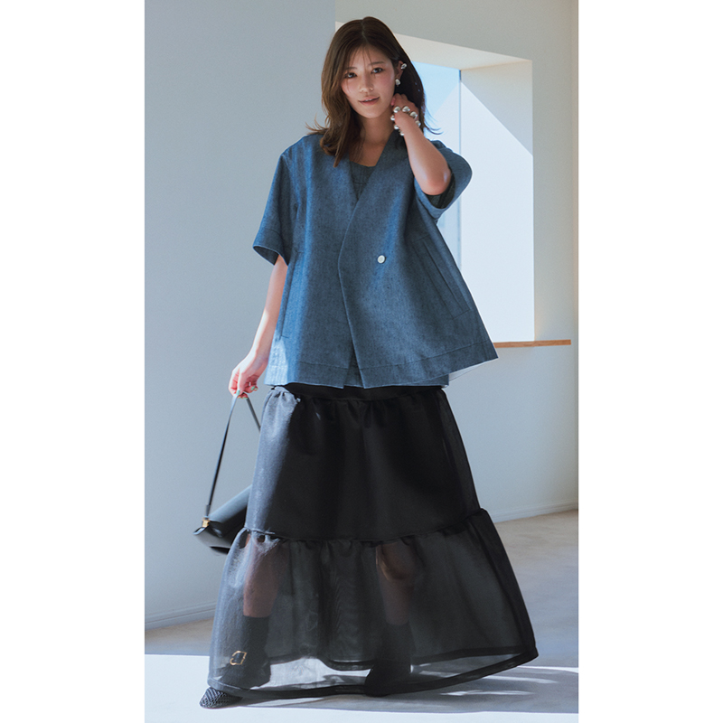 スカート¥49,500(サクラ/インターリブ)ジャケット¥59,400(カオス/カオス丸の内)シースルートップス¥11,000(ユナイテッドアローズ/ユナイテッドアローズ 麻布台ヒルズ ウィメンズストア)Tシャツ¥9,790(ティッカ)バッグ¥27,527(ムシンサ/ムシンサ グローバル ストア)パンプス¥154,000(セルジオ ロッシ/セルジオ ロッシ カスタマーサービス)カチューシャ¥17,600(アレクサンドル ドゥ パリ/アレクサンドル ドゥ パリ GINZA SIX店)ネックレス¥46,200(リューク)