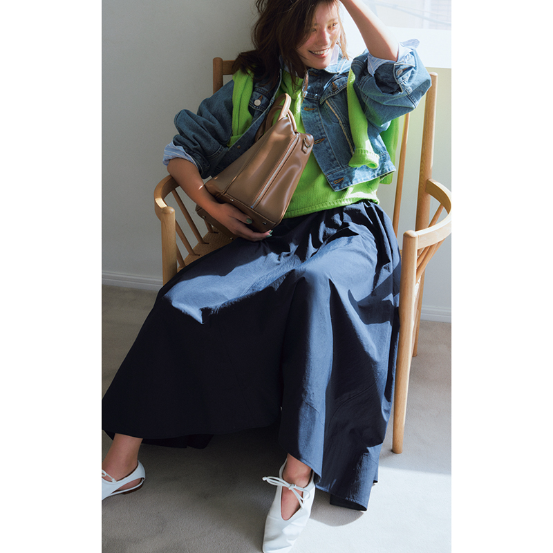 スカート¥34,100(ロンハーマン)デニムジャケット¥20,900 バッグ¥12,100(ともにアダム エ ロペ)セーター¥19,800 カーディガン¥24,200〈ともにボールジィ〉パンプス¥36,300〈ピッピシック〉(すべてトゥモローランド)シャツ¥25,300(ブラームス/ワンダリズム)
