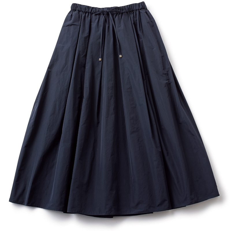ドローストリングでウエスト調整ができるスポーティなフレアスカート。洗濯機洗いが可能で、Tシャツやスウェットとあわせてタフに着回せる。